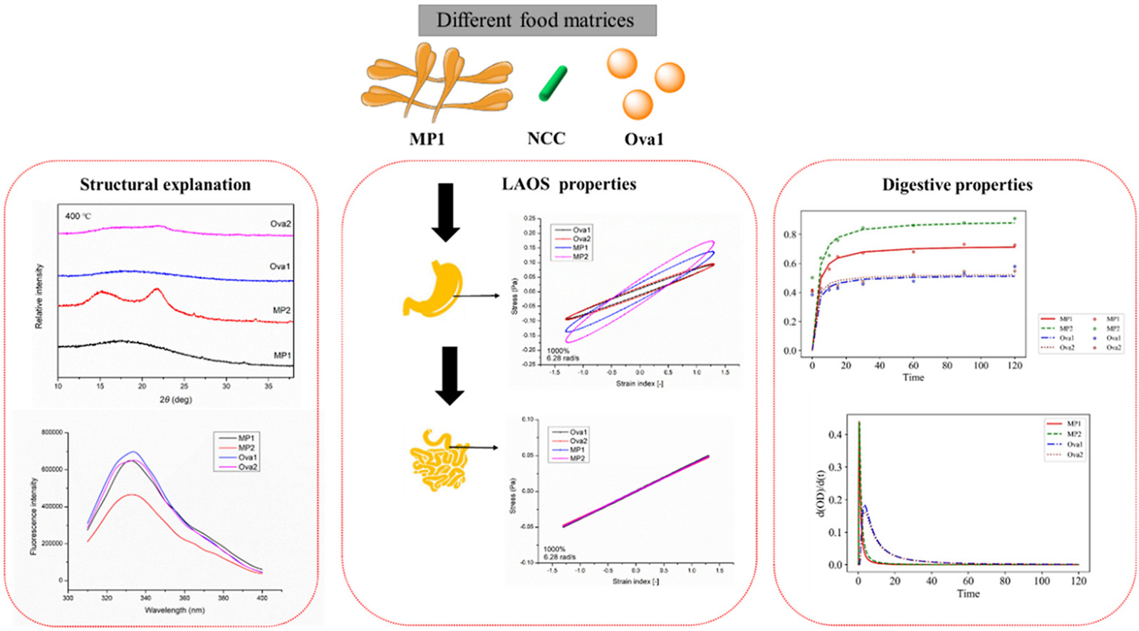 本研究旨在调查不同食物基质中蛋白质消化率的变化。还提出了对纳米晶纤维素 (NCC) 处理响应的蛋白质的结构描述。通过变温X射线衍射(VT-XRD)和多光谱方法表征了各种样品的构象变化。结果提示,NCC诱导不同蛋白质样品的适度展开和聚集。值得注意的是,修饰的肌原纤维蛋白 (MP) 的原始状态被胃蛋白酶催化破坏,导致类似于刚性卵清蛋白 (Ova) 系统的流变行为。根据消化动力学参数和蛋白质组学分析,用 NCC 处理后,柔性 MP 样品比刚性 Ova 系统具有更高的胃消化率,但它们在肠道消化阶段各不相同。还证明了柔性蛋白质系统对 NCC 抑制作用的潜在屏蔽作用。这些发现表明,蛋白质消化率与基质结构和组成有关。